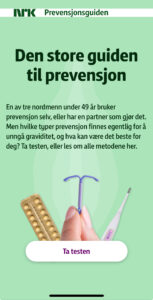 Vi har også, sammen med NRK, utviklet en digital prevensjonsguide som kan hjelpe deg å finne riktig prevensjon, basert på hva du synes er viktig.